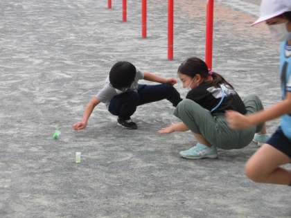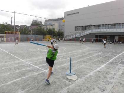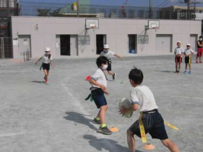 良い天気の中、校庭ではクラブ活動を楽しんでいます。タグラグビークラブ、理科クラブ、球技クラブの子どもたちが楽しく活動しています。