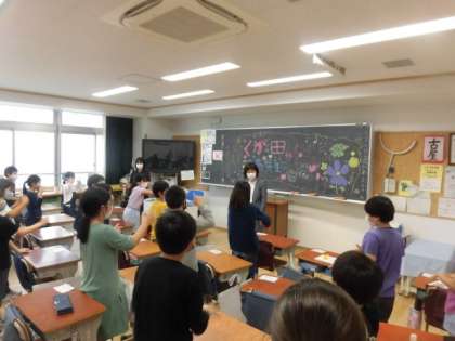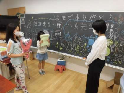 離任された先生方に教室を回っていただき、お別れをしました。教室には飾り付けがしてあり、子どもたちは先生方がいらっしゃるのをとても楽しみにしていました。