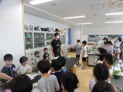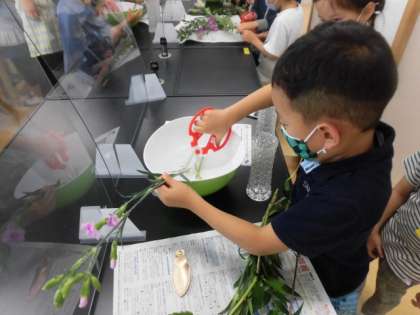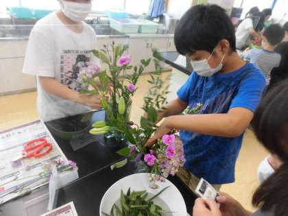 児童朝会で校長先生がお話ししていたアジサイがあり、子どもたちは「ピンク色のアジサイだね。」「茎も長いんだね」と話していました。