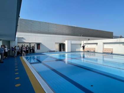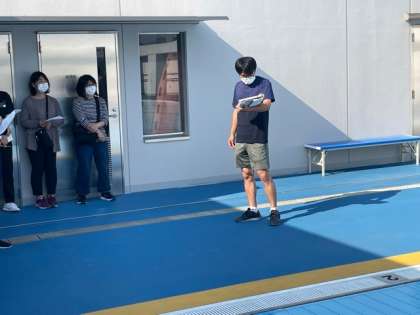 清掃と注水が終わった屋上のプールで先生方が今年度の水泳指導の仕方の確認をしています。密を避けるようタオルかけの位置を決めたり、上履きを入れる靴箱も間を空けて使用したりします。指導の方法についても確認しました。感染予防をしたうえで安全なプール指導ができるようみんなでしっかりとシミレーションしていきます。
