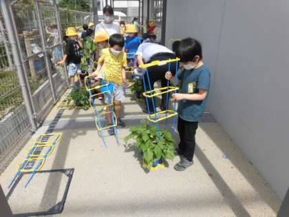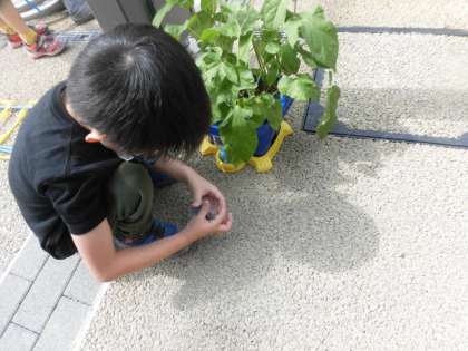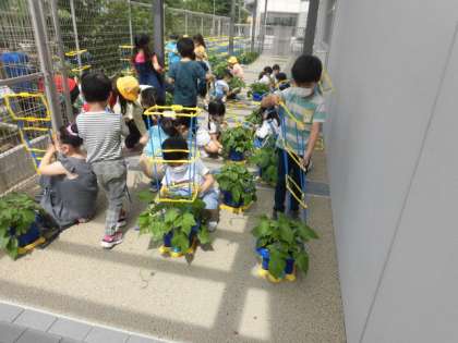 毎日の水やりを欠かさず行い、天気にも恵まれて、1年生が育てているあさがおがぐんぐん成長しています。つるものび始めているものもあり、今日支柱を立てていました。ひりょうも追加してまいていました。