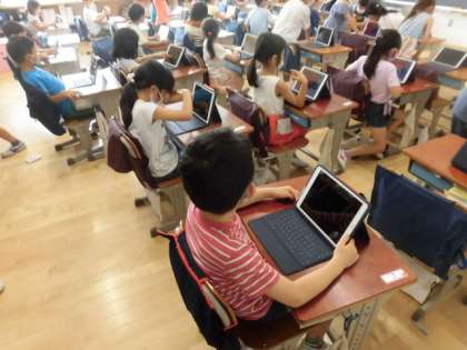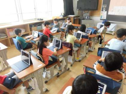 今日は、1年生と2年生の全クラスが初めて教室でタブレットを使いました。カメラで写真を撮っているクラスもありました。色々なことができそうですね。これから、少しずつ覚えていきましょうね!