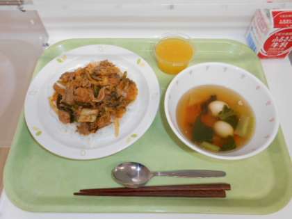 キムチ丼 牛乳 春雨スープ みかんゼリー