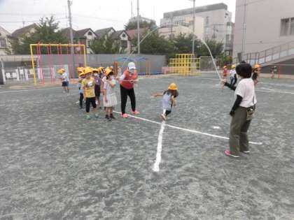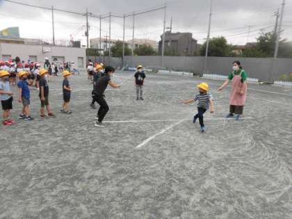 1年生も一回転する縄に挑戦です!よく見て跳べる子もいました。跳べなくても、勇気を出して縄にぶつからないようにくぐり抜けられていました。