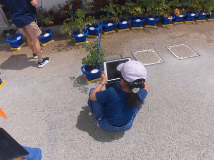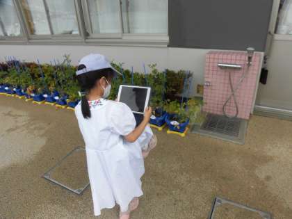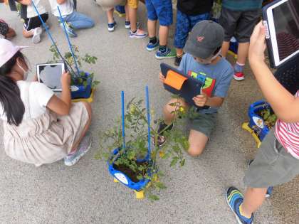 2年3組の子どもたちが、タブレットを使って、育てている野菜の様子を写真に撮って観察しています。ちょうどよいアングルになるように鉢を移動したり、タブレットの位置を調整したりしながら写真を撮っています。