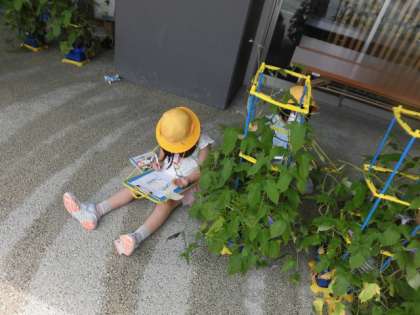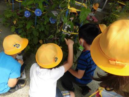 1年2組が、生活科の学習であさがおのつぼみの観察をしていました。