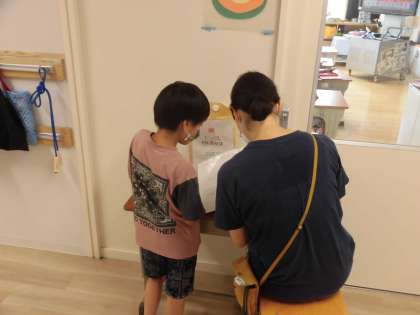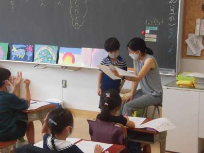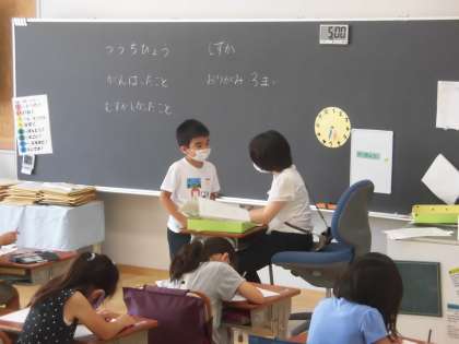 1年生が担任の先生から初めての通知表「わかば」をもらっています。楽しみにしていた通知表、お家までしっかりと持って帰りましょう。