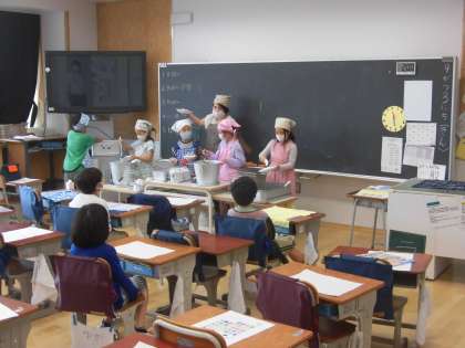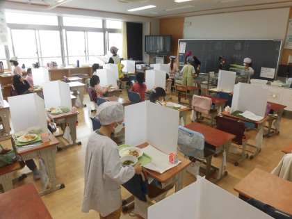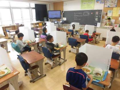 今日から給食が始まりました。登校した子どもたちの中で当番になった子は、家から持ってきたエプロンと三角巾をして準備をしています。半分の人数なので、すぐに準備ができました。食べるときはみんなとても静かに食べていました、お家でオンラインで授業に参加した人のお家での食事の様子をテレビに映してみんなで一緒の食べているクラスもありました。2学期の給食、おしゃべりできないのは残念ですが、しっかりと感染予防をしていきましょう。