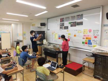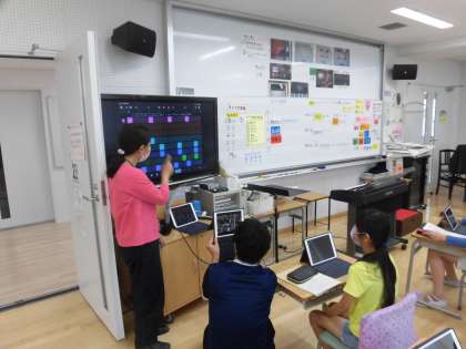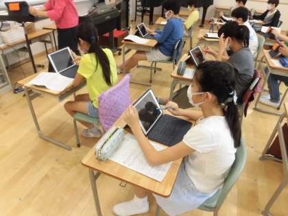 6年1組の子どもたちが、[GaregeBand」を使って曲作りに挑戦しています。家で参加している子どもたちの先生の説明をオンラインで聞きながらの挑戦です。とても楽しそうに活動しています。