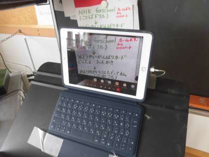 1年3組の子どもたちが、体育館で体育の授業をしています。人数が半分なのでいつもより広々としています。お家でオンラインの子どもたちは、先生が出した課題に取り組んでいます。