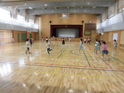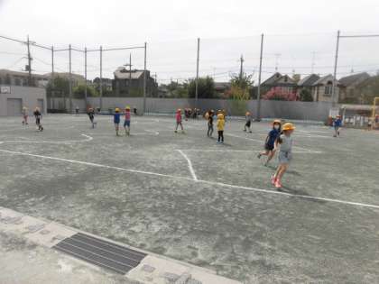 校庭は1年生、体育館は2年1組が遊んでいます。