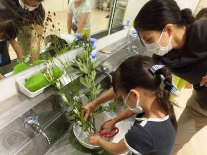 二学期最初の「花を生ける日」がありました。感染予防のため、今月は各教室で花を生けました。