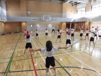 体育館で2年2組が運動会の表現の練習をしています。学年全体でと密になるので、1クラスずつ1組の担任の先生が指導しています。一つ一つの動きをみんな確認しながら楽しく取り組んでいます。