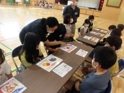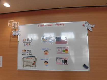 1つ目のブースは、「Travel Agency」です。「I want to 〜」の文をを使って会話をしながら、旅行の計画を立てます。先生が、話す言葉を教えてくださったので、子どもたちは安心して話せています。