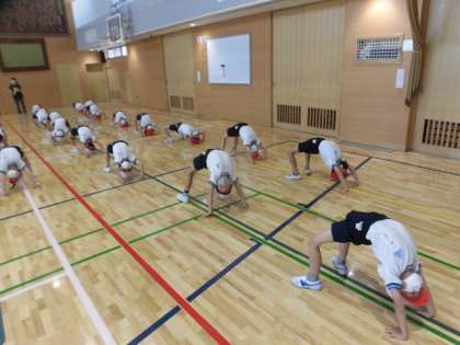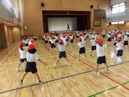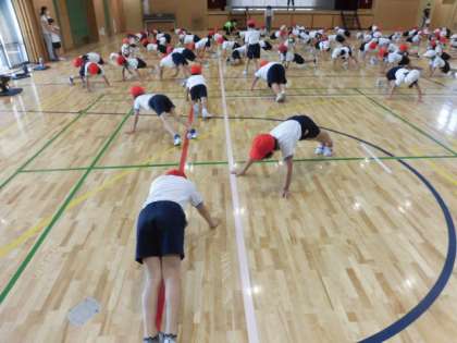1年生が全クラス集まって、体育館で運動会のダンスの練習をしています。音楽に合わせて楽しく踊ったり、ブリッジをしたり、みんなとても上手です。