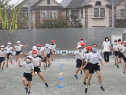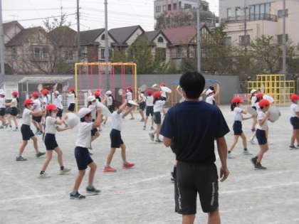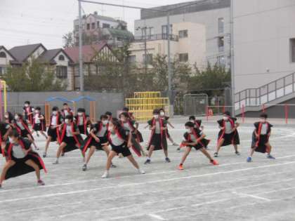 天気が心配されましたが、校庭での練習ができました。音楽に合わせて楽しく踊っています。