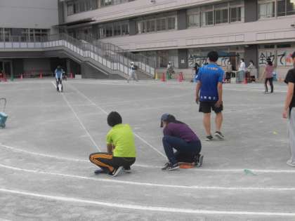 子どもたちが下校した校庭では、先生方が協力して明日の運動会の準備をしています。子どもたちが思いきり力を発揮できるよう先生方も頑張っています。