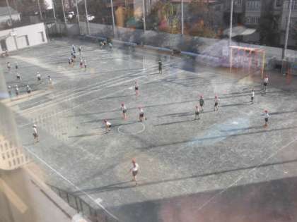 晴天の中、校庭ではタグラグビーや野球をしています。
