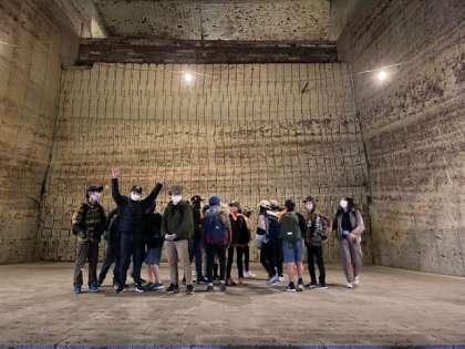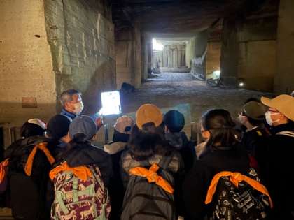 最初の見学場所は、大谷資料館です。大谷石の採掘跡をガイドの方に案内していただきながら見学しています。広い空間にびっくりしながら見ています。地下なのでひんやりしています。