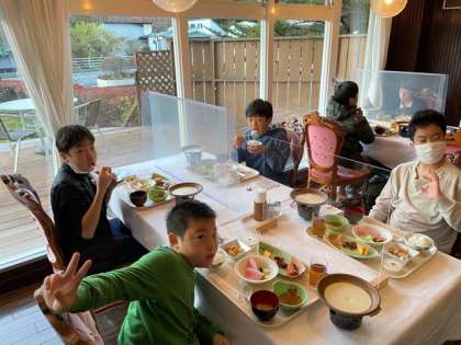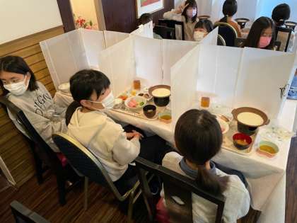 朝食は2クラス一緒に取ります。学校から持ってきたパーテーションを宿舎の人が並べてくれました。今日は、ハイキングです。しっかり食べましょう。いただきます。