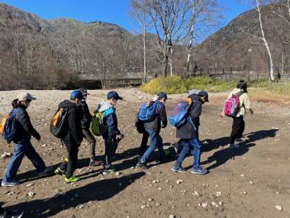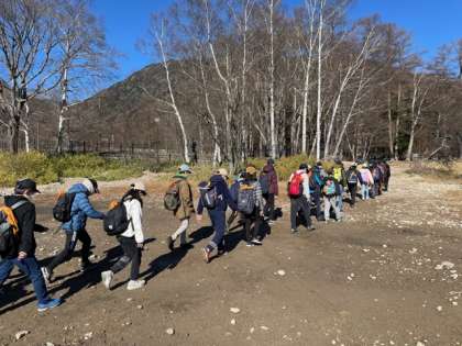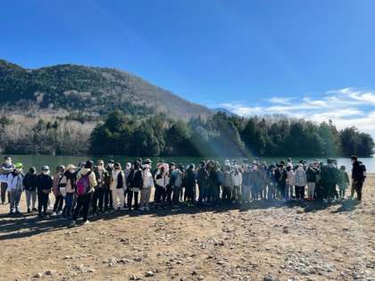 湯の湖で学年で集合写真を撮りました。これからら湯滝までハイキングします。
