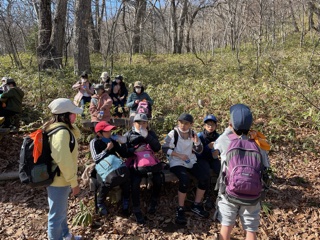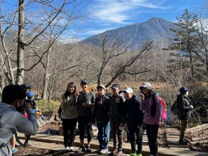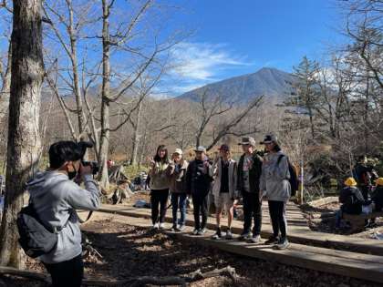 戦場ヶ原ハイキング、頑張って歩いています。男体山をバックに記念撮影です。休憩のスポーツドリンクが美味しいです。