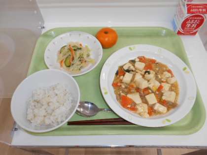 麦ごはん 牛乳 家常豆腐 春雨サラダ くだもの