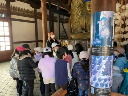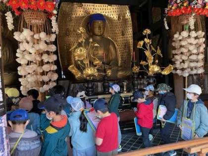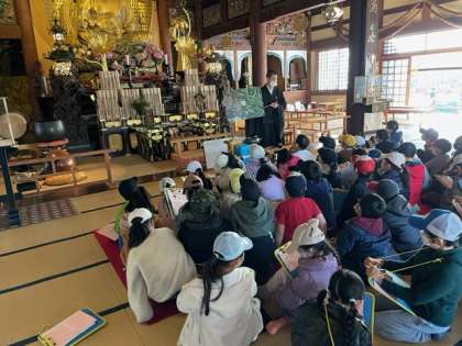 本堂に靴を抜いて上がって説明を聞きました。その後、お堂に行って話を聞いています。