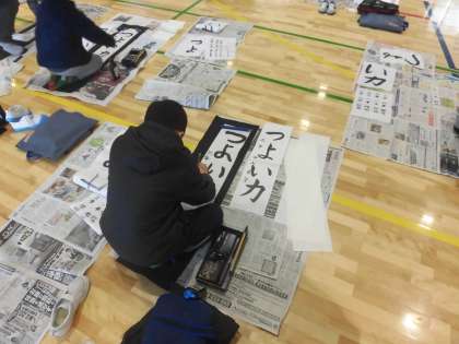 1年1組の子どもたちが、教室で書き初めをしていました。みんな真剣、鉛筆の音しか聞こえません。3年生は、初めての毛筆の書初め。体育館に学年で集まって書いています。少し緊張しているようにも見えます。力作が完成しました。