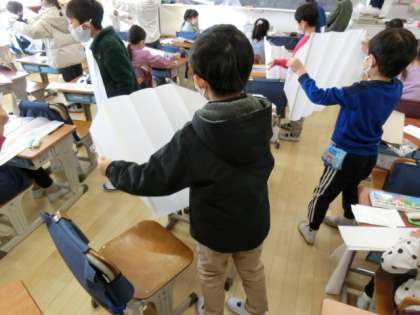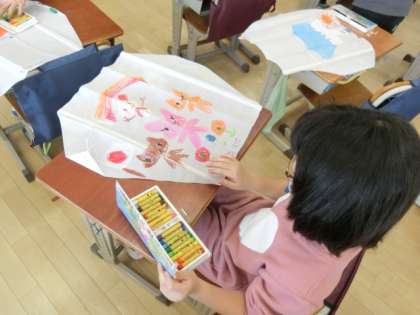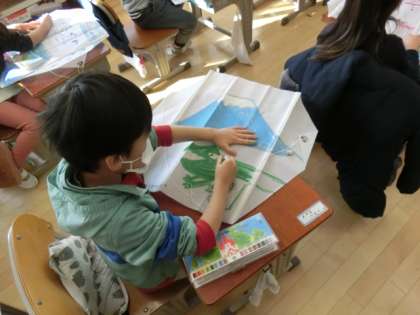 1年生が、凧あげの凧を作っています。自分の体と同じくらいに凧に思い思いに絵を描いています。世界にに一つだけの凧が完成しました。
