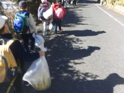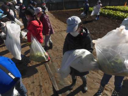 あっという間に収穫終了。収穫後には、畑に落ちている汚くなってしまった葉っぱをみんなで拾いました。畑がとてもきれいになりました。小松菜を入れたビニールを大事そうに抱えてバスに乗って学校まで戻りました。収穫した小松菜は、持ち帰りますので、家で食べてみてください。