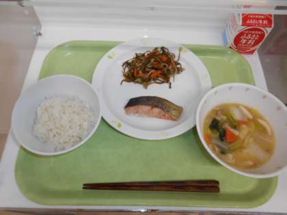 麦ごはん 牛乳 魚の塩焼き 五目きんぴら すいとん