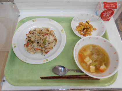 磯おこわ 牛乳 いわしのつみれ汁 お豆かりんとう