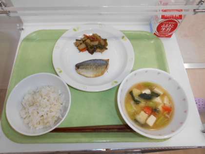 麦ごはん 牛乳 魚の照り焼き くきわかめの炒め煮 豆腐汁