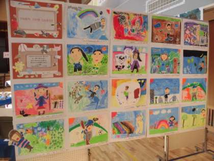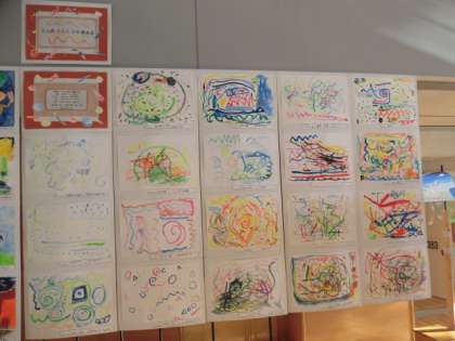 展覧会が無事終了しました。保護者の皆様には、作品作りから鑑賞まで、様々ご協力いただきありがとうございました。本来なら、多くの方に子どもたちの力作をご覧いただきたかんのですが、新型コロナウイルス感染症のため、鑑賞人数を制限したり、時間を決めさせていただいたりしての実施となりました。そのため、見に来られなかった方もいらっしゃると思います。少しでも展覧会の雰囲気を味わっていただけるよう作品の紹介をさせていただきます。最初は、1年生の平面作品「せんのかんじ いいかんじ」と「できたらいいな こんなこと」です。