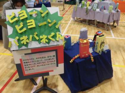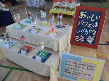 2年生、立体作品。「ビヨーン!ビヨーン!ネバネバくん」「おいしいパフェはいかが?」です。