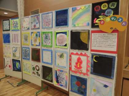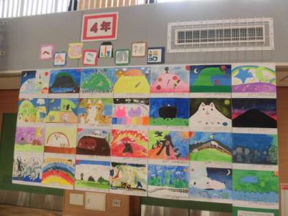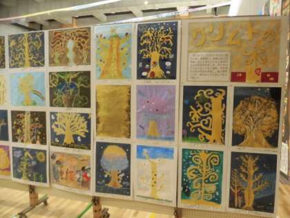 4年生平面作品「絵の具 DE アーティスト」「クリムトの木」「ヘンテコ山の物語」です。