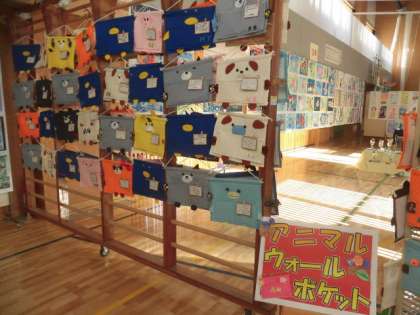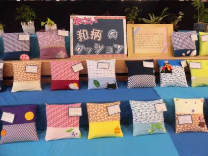 家庭科の作品です。5年生「アニマルウォールポケット」、6年生「和柄の小さいクッション」です。