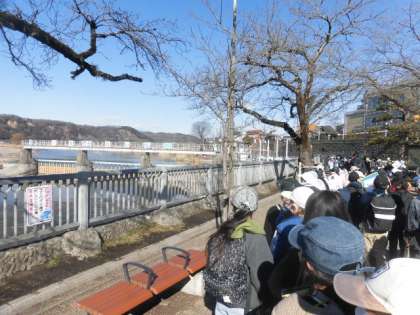 羽村の取水堰では、玉川兄弟の像も前で写真を撮りました。多摩川にかかる投渡堰や玉川上水へ水を取り込む水門の様子などを見ました。勢いよく多摩川の水が上水の方へ流れていく様子がよくわかりました。