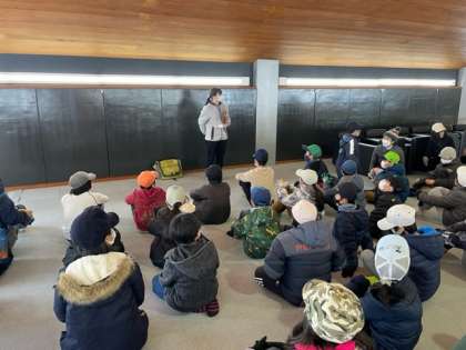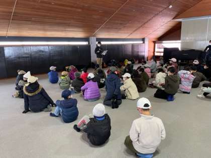 里山入門を始めます。二つのグループに分かれてビレジの方に案内してもらいます。まずは、村の会堂で川場村の話を聞いています。