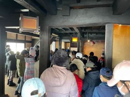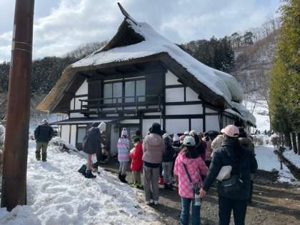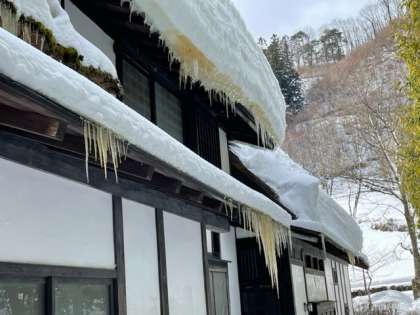古民家を、見学しています。茅葺きの屋根には雪が積もり、立派なツララも見られました。