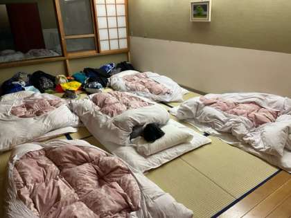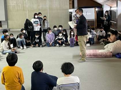レクレーションを終えて、布団の敷き方、片付け方を教わってバナナを食べてお風呂に入って、川場の1日めは終了です。班長さんは集まって今日の反省会をしています。明日も元気に頑張りましょう。