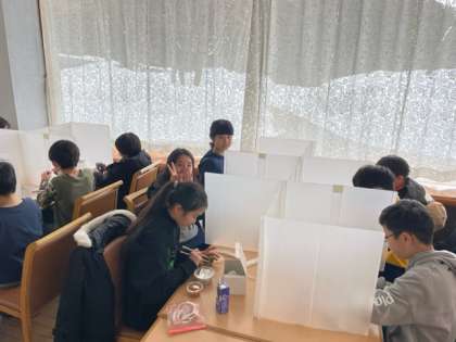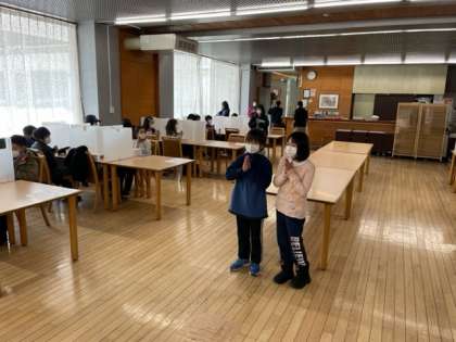 ふじやまビレジ、最後の食事です。メニューは、わかめごはん、鶏のから揚げ、ブロッコリーおかか、きんぴらごぼう、ぶどうジュースです。美味しい食事をありがとうございます。雪遊びでお腹もすきました。味わっていただきましょう。