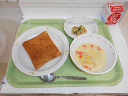 シナモントースト 牛乳 クリームスープ ビーンズサラダ