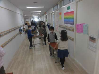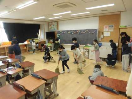 1年間、お世話になった教室の大掃除をしています。机を運んで、掲示物もとって、ほうきできれいにはいて、みんなで協力してきれいにしています。次に教室を使う人が気持ちよく使えそうです。