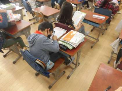 新しい学年で使う教科書を図書室から教室に運んで配りました。一冊一冊真新しい本に名前を書いています。お家に持ち帰りましたので、落丁等ないか確認をお願いします。
