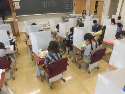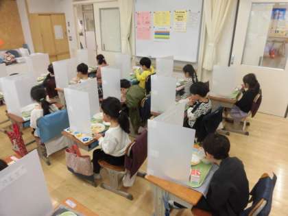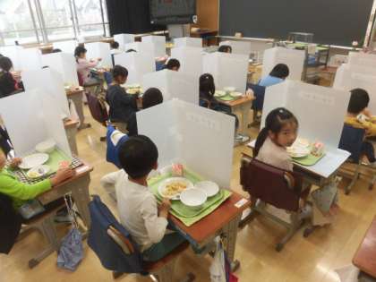 昨日から給食が始まった1年生。今日もしっかりと準備をして、静かに給食を食べています。とても数珠に食べられています。食べ終わった後は「美味しかった」という声が聞かれました。毎日の給食、楽しみにしていてくださいね。