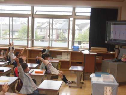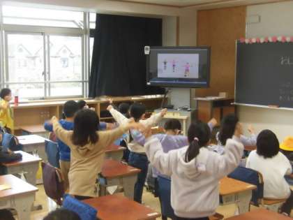 今日の体育朝会は、朝のランランタイムで取り組むラジオ体操の正しい仕方について、体育主任の小池先生から教えていただきました。ラジオ体操のビデオに合わせて体を動かしている人もいました。今度のランランタイムでは、校庭で体をいっぱい動かしてラジオ体操をしましょう。