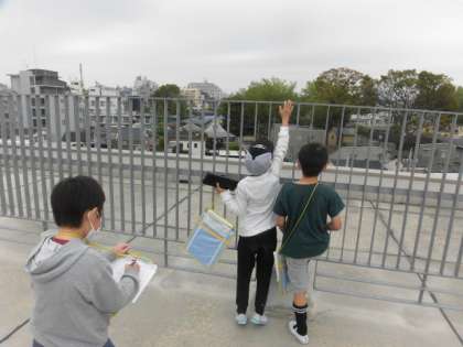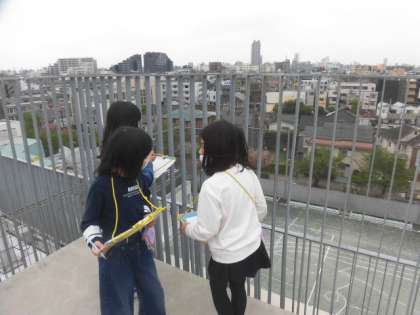 今日は、3年2組が屋上に上がって、町の様子を観察しました。屋上は風が吹くと少し肌寒かったけれど、見学したことをしっかりとワークシートに書いていました。