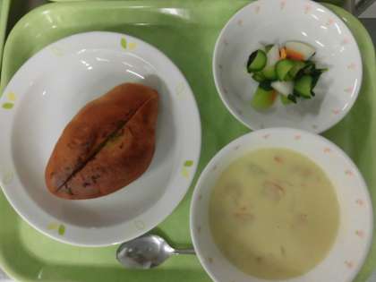 チャウダーはアメリカのスープの一つです。色々な種類があって、具材によって名前が変わります。今日は、チキンシュリンプチャウダーです。日本ではクリームの入った白いチャウダーが有名ですが、トマトの入ったマンハッタン風のチャウダーもあります。給食では様々な国の料理が提供されています。食文化の違いを感じながら食べることを楽しんで欲しいと思っています。